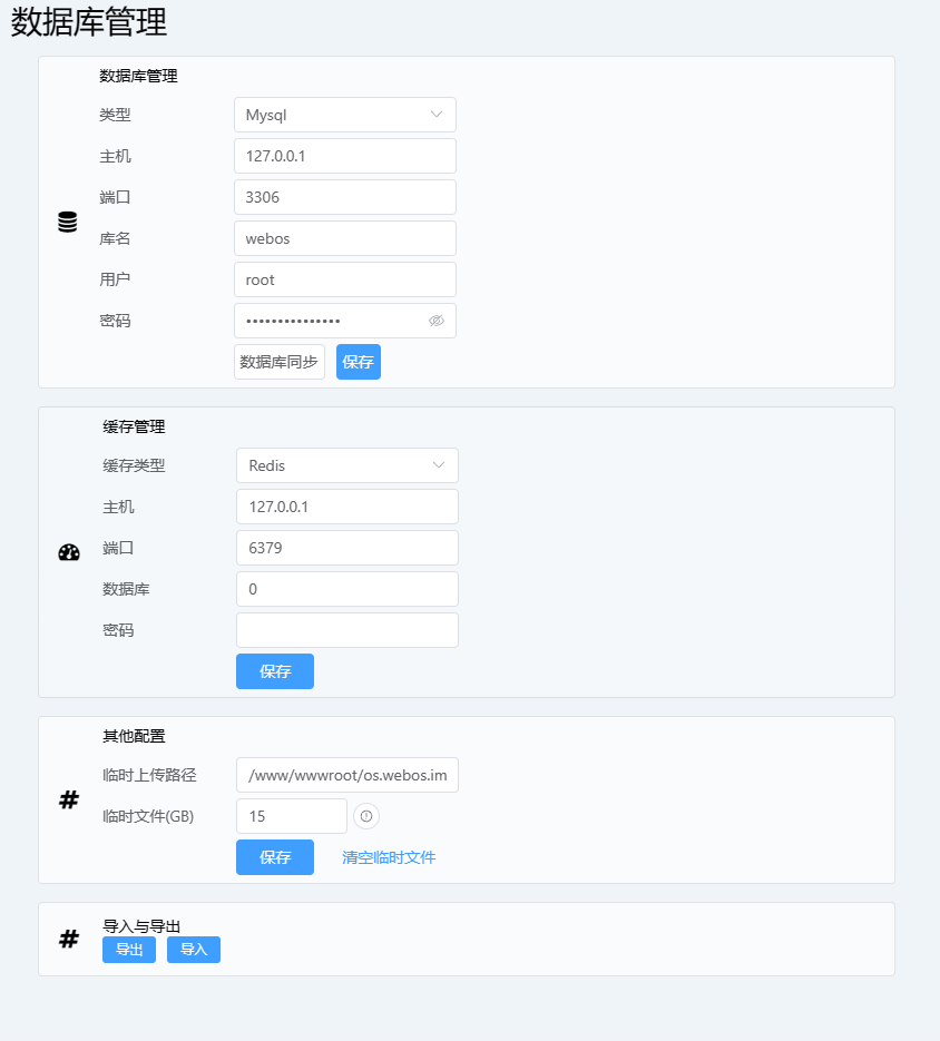 数据库管理 ::: tip 此处管理和切换数据库 ::: ::: danger 注意记得先同步数据库。 ::: 数据库同步 缓存管理 ::: tip 临时文件上传路径及大小设置 超过预设值会删除 ::: ::: warning 总临时文件大小为15GB单个文件大小超过15GB无法通过中转上传,该配置需要重启服务后生效 ::: 导出和导入 导出导入配置文件 如:webos设置及挂载的网盘数据